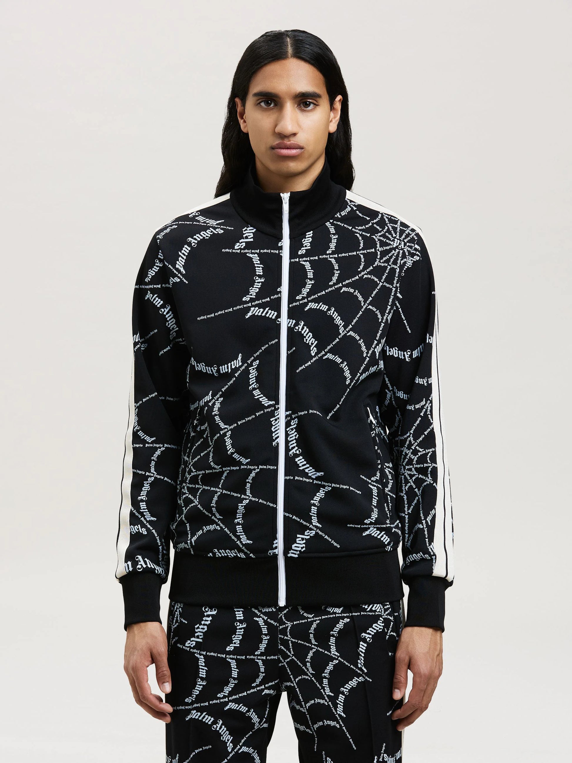 CLASSIC TRACK JACKET PRINTED IN ALLOVER SPIDER WEB PATTERN. RIB KNIT CUFFS, COLLAR AND HEM. FRONT AND POCKETS METAL ZIP. ICONIC BLACK AND WHITE TAPE ON THE SLEEVES. SLIM FIT.